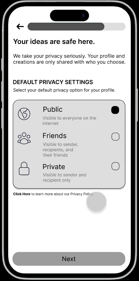 A strong onboarding experience will allow creatives to inform the app of who they are, what they care about, and what they are looking for so that they can connect with people they admire and are inspired by.